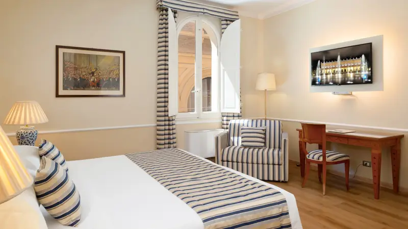 Le camere matrimoniali Standard sono perfette per chi desidera un’esperienza di soggiorno confortevole in un ambiente accogliente. Sono composte da un letto matrimoniale e sono dotate di tutti i comfort per un soggiorno nel centro cittadino.